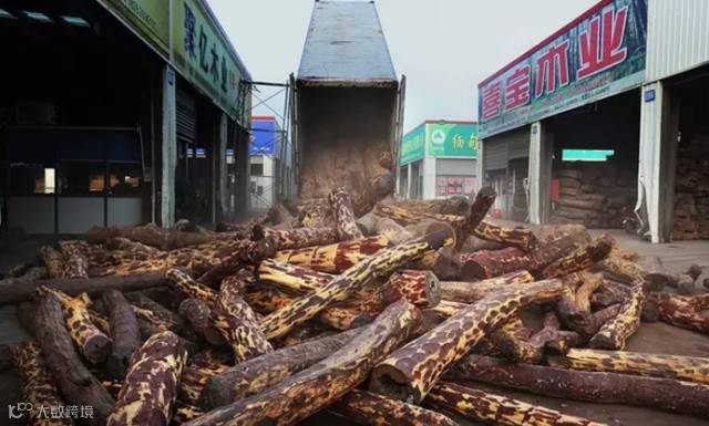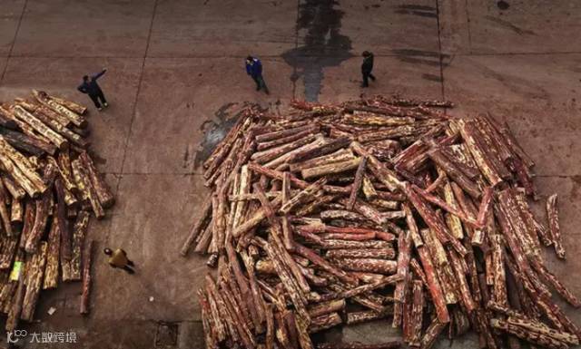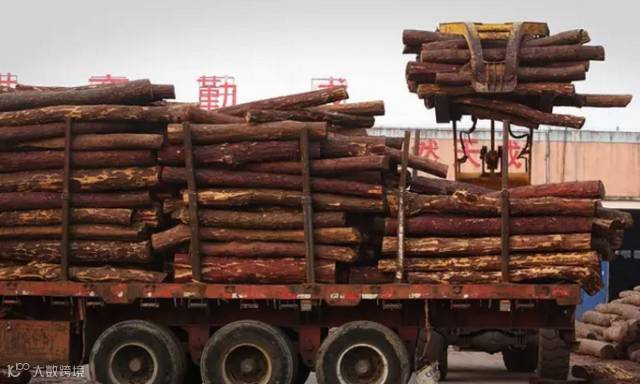 张家港市金港镇最大的血檀交易市场——张家港国际木业城内,正在装车的血檀木材,这个市场每天能收到十几车血檀木材。据市场管理人员说:平均每个月从张家港四个最主要的血檀市场卖出的血檀总和达到近15000吨。