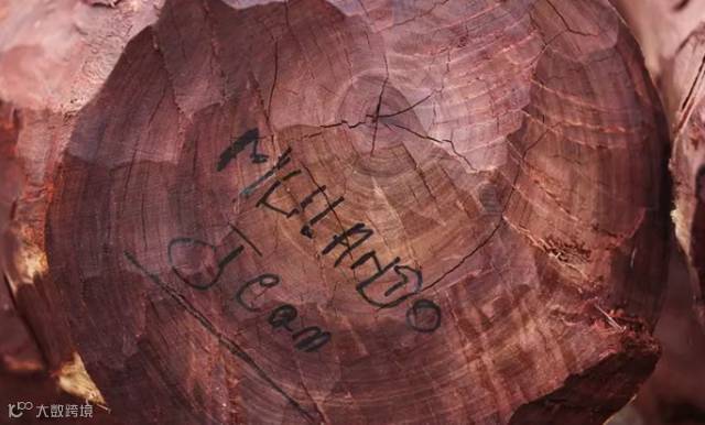 每根血檀木上都标有伐木工的名字,方便之后计算工钱。图为剥完树皮、等待被运走的血檀。
