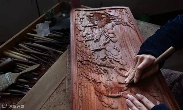 工人正在为血檀家具手工雕花