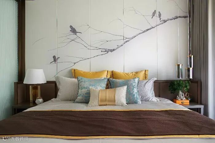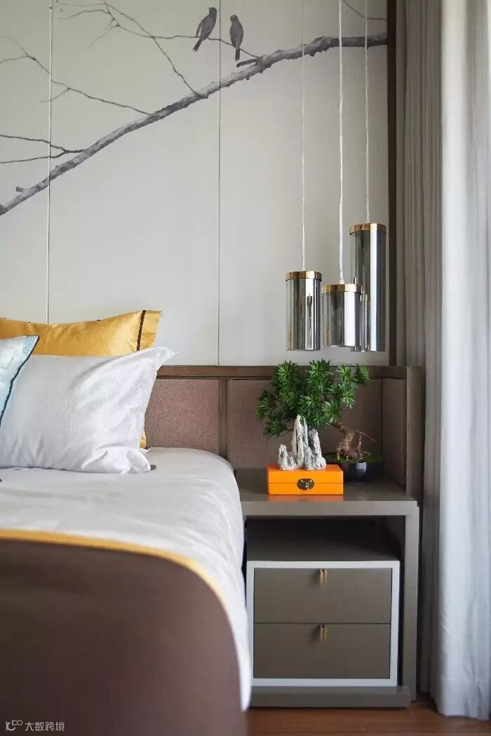 好的设计,既是融合的又是独立的。譬如,主卧的设计自成一格,中式韵味颇浓,但在细节处却可以看到与客厅的呼应,明黄色的抱枕、金属吊灯、绿植盆摘、单椅的造型都能再客厅觅得影子。