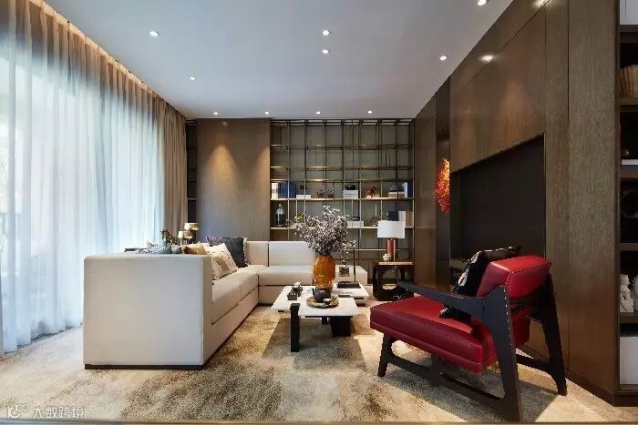 客厅的设计力求简约精致,在风格上融入传统中式元素,如博古架、茶具、灯笼等;在色彩、照明、材质方面尽可能简洁和谐,并对材料质感的要求很高,让造型简洁的家具在点光源的映衬下有种低调的华美,传递出一种舒适、精致的氛围。