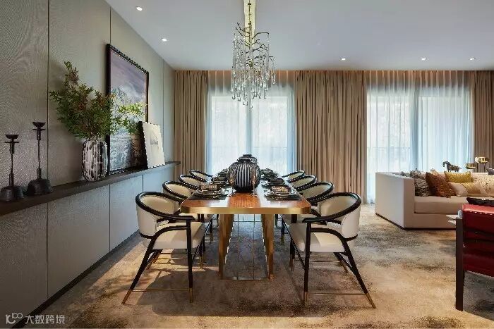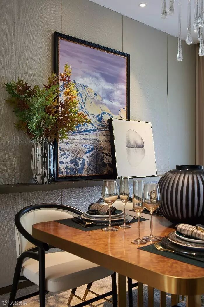 新中式,当下时代的议题,东方的丰富细腻,以现代的方式诠释,将生活形态和美学意识转化成一种无声却可以感知享受的设计语言。对于意境氛围的营造,设计师从细节入手,餐厅的挂画、花艺绿植、摆件,组合成意境小景,赋予日常生活审美情趣。