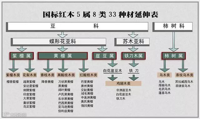 国标里区分了红木五属八类三十三种木材,五属是紫檀属、黄檀属、崖豆属、铁力木属、柿树属。而八类则是:紫檀木类、花梨木类、香枝木类、黑酸枝木类、红酸枝木类、鸡翅木类、乌木类、条纹乌木类。