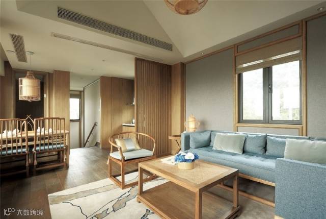 整体素雅清丽、古朴禅意、丝竹交错。虽同处一栋,却是相互交织的三套错层套房,米黄、灰绿、水蓝三个不同的色调,空间演绎又延伸出不同灰度、不同肌理的材质和软装,使得这三户语调统一、层次丰富。即使不断进入这么多个房间,也不会觉得无趣或乏味。