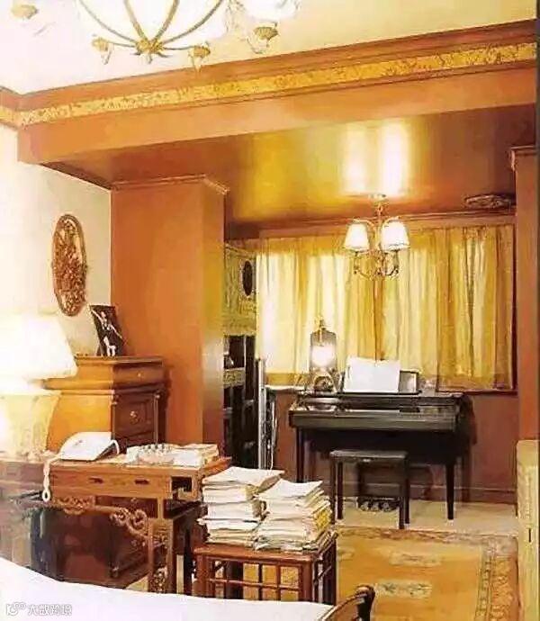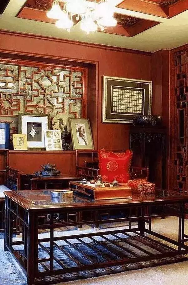陈道明迷恋中国古典风格,家里全是红与黄的暖色调,深色的雕花中式太师椅,文房四宝,闪着铜光的精致铜壶,大砚台和竹制书架。