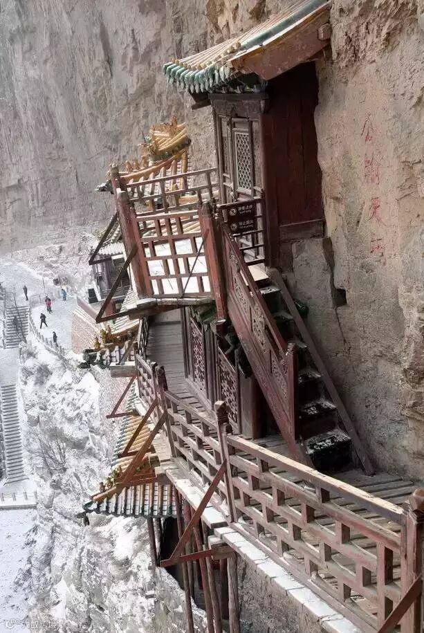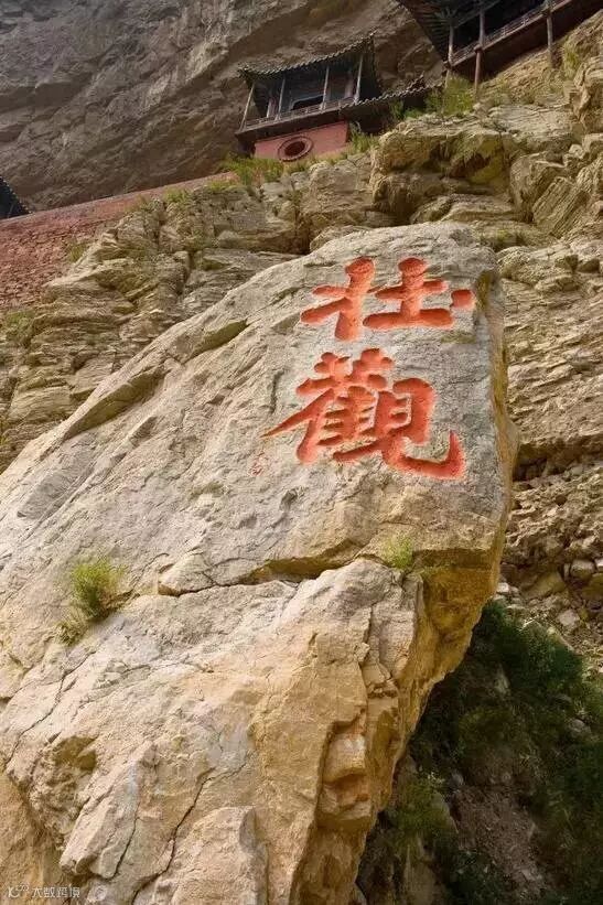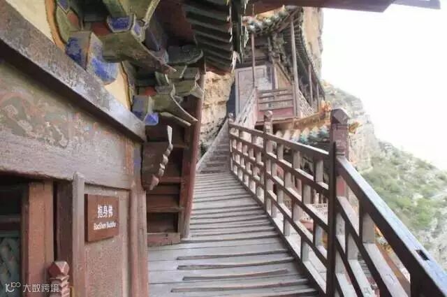 悬空寺共有殿阁四十间,利用力学原理半插飞梁为基,巧借岩石暗托梁柱上下一体,廊栏左右相连,曲折出奇。寺内有铜、铁、石、泥佛像八十多尊,寺下岩石上“壮观”二字,是唐代诗仙李白的墨宝。