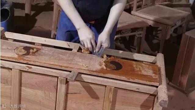 家具组装好,上大漆之前,要进行刮磨,使用十多种刮磨工具进行刮磨,才能使家具平整。刮磨完成后,还需要用目数不同的砂纸进行磨砂,才能使家具质感细腻。这其中,又耗费不少木料。