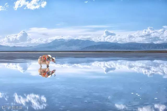 盐湖的水域宽广,银波粼粼,天空湛蓝,白云悠悠,远处山峰雄伟壮阔,雪山映入湖中,如诗如画,四周牧草如茵,羊群似珍珠洒落,漫步湖上,犹如进入盐的世界。
