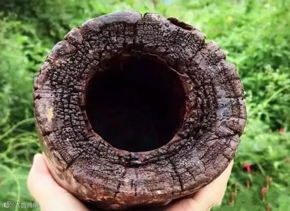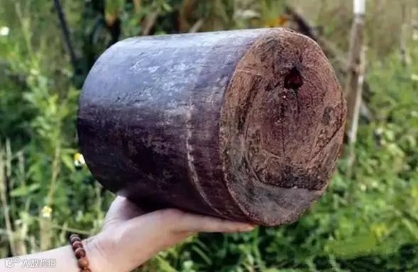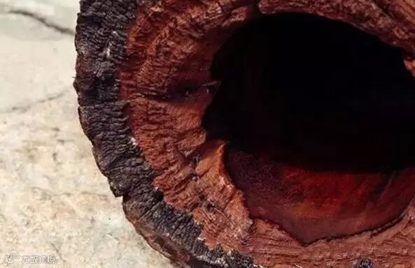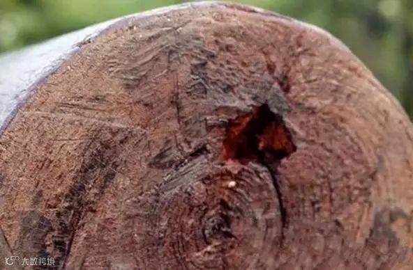 小叶紫檀是红木当中最为坚硬的,一般来说不会被虫蛀,这块紫檀料上的坑洞是人为所致,就这根木料的粗细,想必当年是用来做门柱用的。