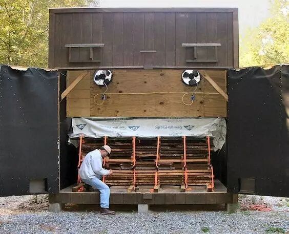 人造或“烘箱”干燥的过程基本上是通过引入热量来进行快速干燥。可直接使用天然气或电力,或间接通过蒸汽加热的热交换器,太阳能也是一种选择。在此过程中,通过控制温度、相对湿度和空气循环等可变的条件,以达到特定的干燥特性。为了实现这一点,木材堆放在密闭空间,其中装有用于控制大气温度,相对湿度和循环速率的设备。