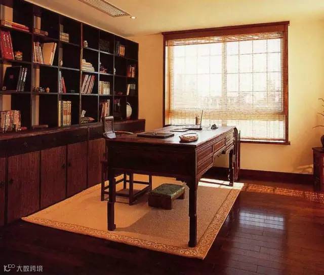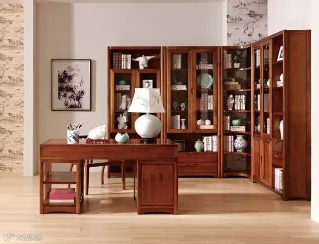 紫檀色的中式家具,多了一份厚重感,气场比较强,适合面积较大的书房。