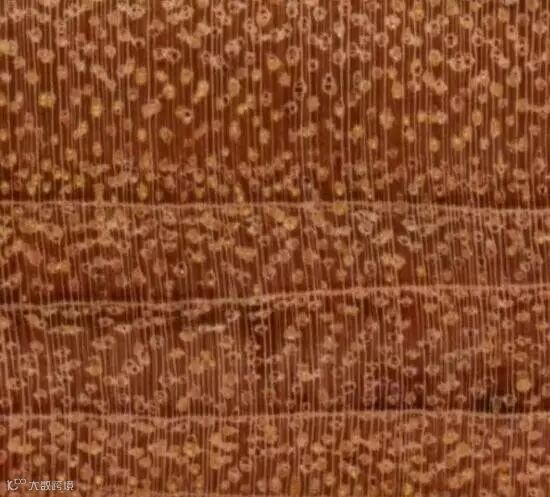 端面:散孔材,单管孔及径向复管孔,大管孔不多见,且没有特殊的排列方式;心材中红色及黄色的树胶填充物偶见;轴向薄壁组织菱形翼状或者连续带状;木射线细,整齐排列。