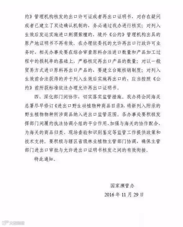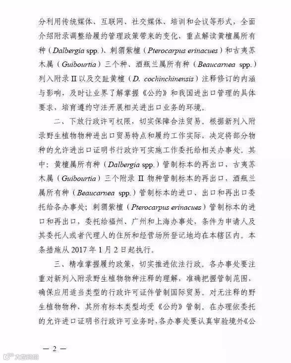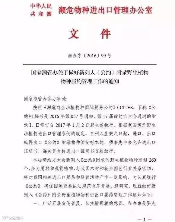 国家濒管办2016年11月29日发布:《中华人民共和国濒危物种进出口管理办公室文件濒办字〔2016〕99 号 》,关于做好新列入《公约》附录野生植物物种履约管理工作的通知,其正文内容如下所述。