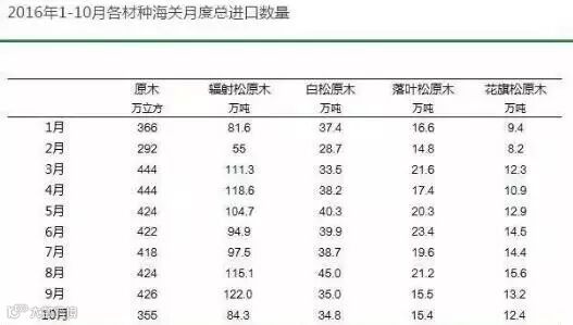2016年1-10月份,海关数据显示,辐射松原木进口985万吨,遥遥领先于其他进口松木(白松原木371万吨,落叶松原木186万吨,花旗松原木124万吨),各品种的松木进口数据月报表如下: