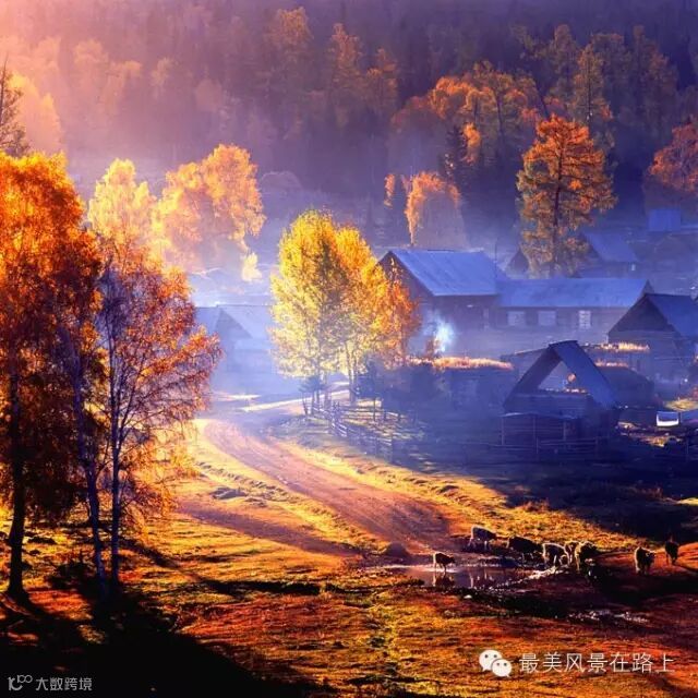 初升的太阳洒落在白桦林掩映的小木屋上,炊烟从屋顶飘起,好一派田园风光,那虚无缥缈的晨雾,仿佛给村庄披上了醉眼迷离的衣裳,向世人展示她迷人的风姿。