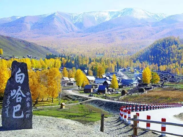 位于阿尔泰山山脉的山谷平地上,与哈萨克斯坦的大山遥遥相望,阿尔泰山上密密麻麻的金黄金黄的松树林一直延伸到白哈巴村里,村民住的木屋和圈养牲畜的栅栏错落有致地散布在松林和桦林之中,安宁、祥和。