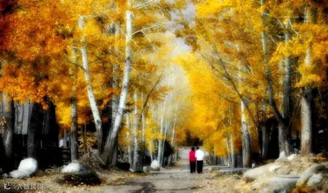 在暖暖的阳光的照耀下,迎着上午的晨光,向村庄深处走去,到处是金黄金黄的落叶,到处是金灿灿的白桦林。小溪流,流经村庄,那是一条充满生命气息的河流。它打通了村庄的经脉,为村庄送去甘泉和清凉。满树的叶子随着风的律动,洒落在林荫小道上,洒落在小溪旁,铺在鹅卵石上,让人倍感心旷神怡。