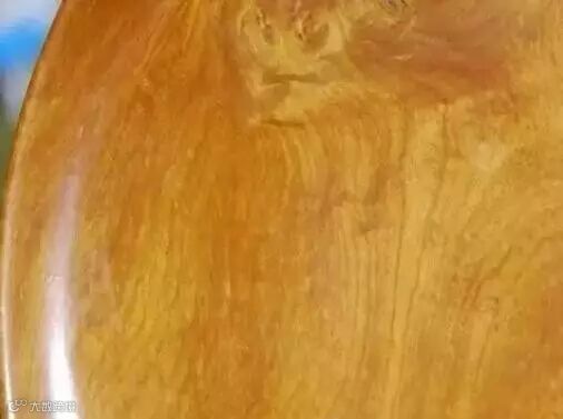 上图为直径超过30厘米的金丝楠大果盘正面局部。从成品上依然无法分清树种,但是使用心材制成是毫无疑问的。根据其木质结构、香气、油性、比重判断,应是桢楠属的一种(怀疑是紫楠树种),其上部还有一处瘿子纹。因其树木生长地在亚热带,同时具有润楠属木材的一些特征。这个例子表明,同一个树种,因生长地域不同,其木材会出现很大差异。