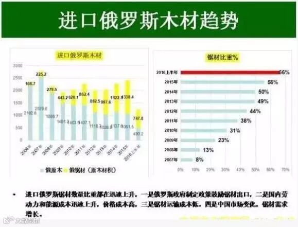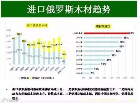 我国进口俄罗斯锯材数量这些年急剧上升,一是因为俄罗斯鼓励,二是我国国内劳动力成本升高,三是锯材运输成本更低,四是国内木材市场发生变化,锯材更受市场欢迎。