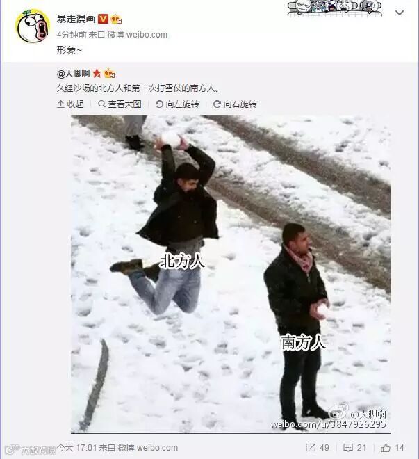 网友们做的南方人、北方人打雪仗的图片也非常形象!