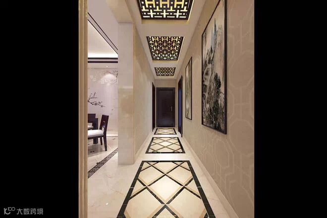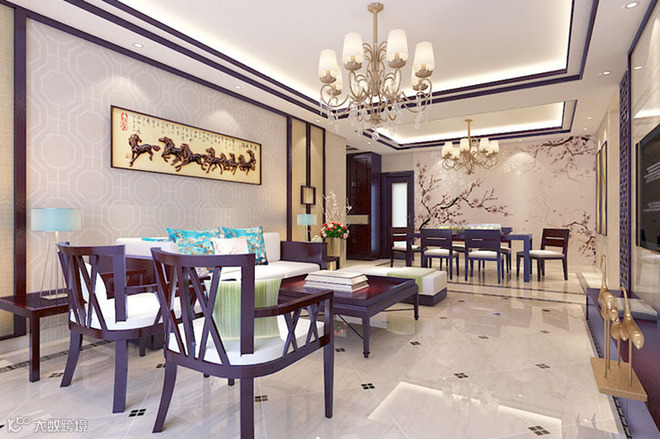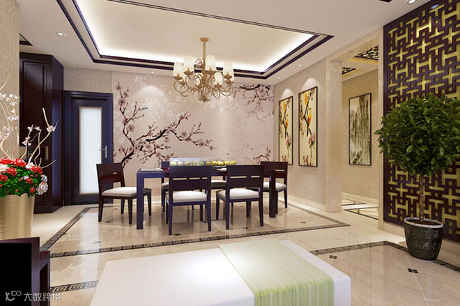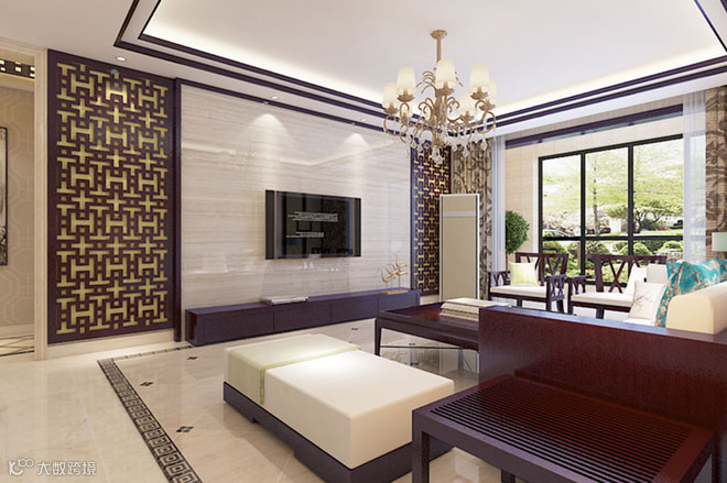 在中国文化风靡全球的现今时代,本案采用中式元素与现代材质的巧妙兼柔,花格与布艺相互辉映,再现了移步变景的精妙小品。中国风并非完全意义上的复古明清,而是通过中式风格的特征,表达对清雅含蓄、端庄丰华的东方式精神境界的追求。客厅通过地面拼花与顶部相呼应的造型对整个空间进行了分区。光洁的微晶石地砖,配上大面积的石材造型使整个空间沉稳且不失尊贵。餐厅与餐厅造型交相呼应,使空间整体而不散乱、奢华而不繁杂。