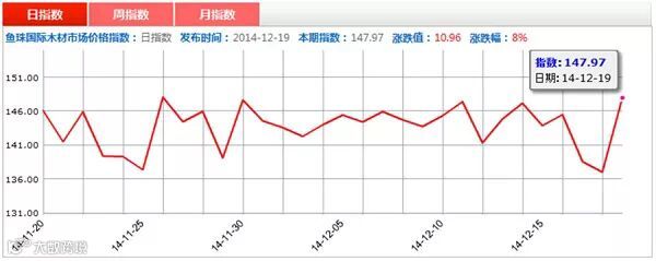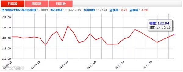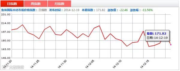 12月19日,鱼珠•中国木材价格指数报收146.88点,上涨4.89点,涨幅3.44%,同比下跌1.12点,跌幅0.76%。红木分类指数报171.82点,日环比跌22.46点,跌幅11.56%;原木分类指数报收131.22点,日环比下跌7.74点,跌幅为5.57%;锯材分类指数报收147.97点,环比上涨10.96点,跌幅为8%;人造板指数报收122.94点,上涨0.6%。