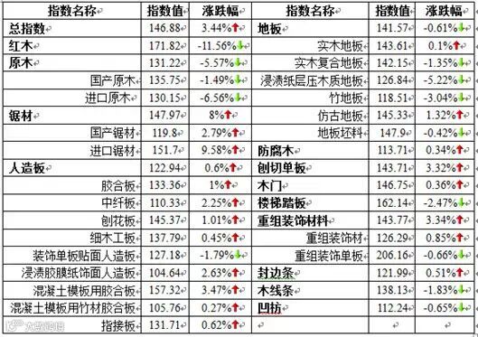 从盘面上看,多种分类指数重拾升势激活了部分市场人气,九种分类指数除装饰单板贴面板人造板指数出现下跌外,其余均出现上涨,其中胶合板指数报收133.36点,上涨了1%,指数触底反弹,市场交投较为冷清,成交较为有限,价格以回落调整为主,除12厘板维持不变外,其余均下调了0.5元/张;截至收盘,交易额下跌了4.34%。中纤板指数继续上涨,指数重回110点高线,报收110.33点,上涨了2.25%,代表品市场回暖,成交放大,截至收盘,成交量上涨32.13%,交易额上涨14.28%。刨花板指数结束三连阴,出现上涨,报收145.37点,上涨1.01%。混凝土模板用胶合板指数跌宕起伏,指数报收157.32点,上涨3.47%,是今天指数行情上涨的领头羊,主要受到其代表品价格上扬的推动,截至收盘,18厘素板价格上涨0.5元/张,报收73元/张;18厘覆膜板价格上涨1元/张,报收93.5元/张;18厘清水板价格指数报收128.21点,上涨了0.49%。浸渍胶膜纸饰面人造板指数继续飘红,指数报收104.64点,上涨2.63%,创本月新高;代表品市场交投活跃,出现量价齐涨,截至收盘,交易额上涨了14.33%。