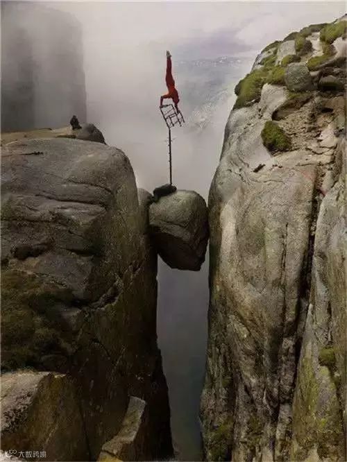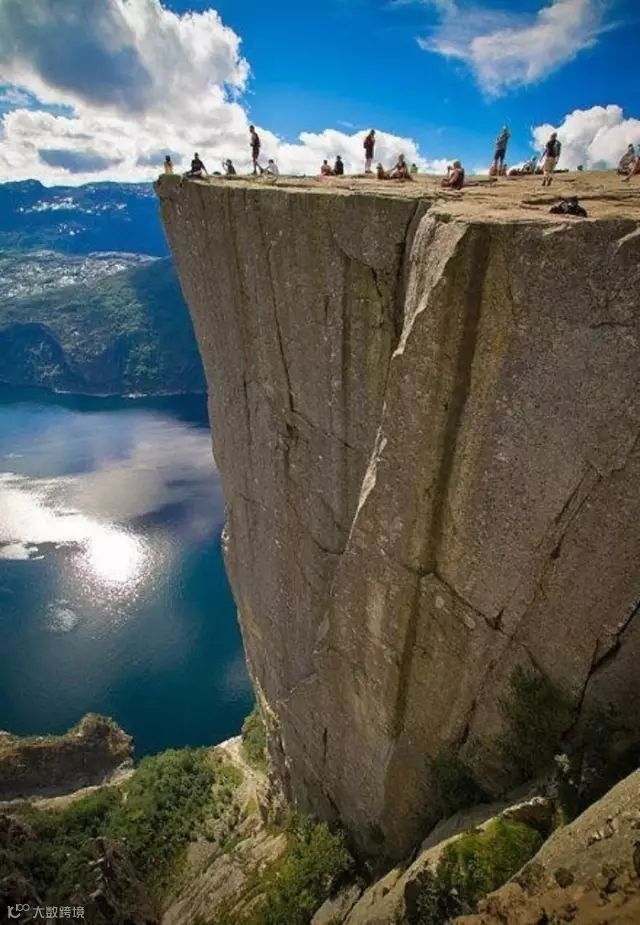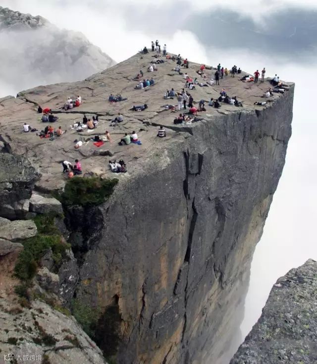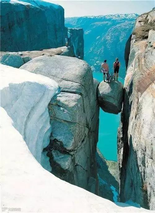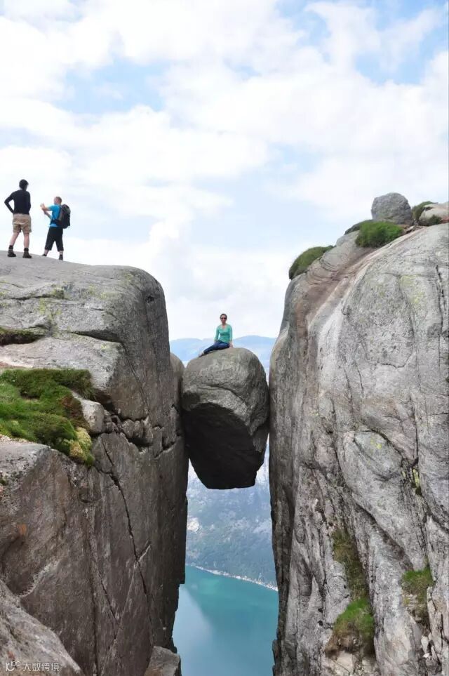 挪威“奇迹石”是挪威最负盛名的旅游景点,这块有5立方米大的石头卡在绝壁间,“奇迹石”坐落于挪威谢拉格山的山顶之上,距离谷底大约1000米。“奇迹石”也是一块“勇敢者之石”,如果你有胆量爬到奇迹石上面,谷底的无限风光便可一览无余。但对于胆小的旅行者,有必要提醒他们“千万不要往下看”,万一腿一软,没准就跟这个世界告别了。