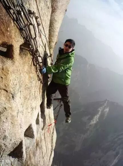 俗话说:“自古华山一条路”。“长空栈道”位于华山南峰东侧山腰,是华山派第一代宗师元代高道贺志真为远离尘世静修成仙,在万仞绝壁上镶嵌石钉搭木椽而筑。栈道上下皆是悬崖绝壁,铁索横悬,由条石搭成尺许路面,下由石柱固定,游人至此,面壁贴腹,屏气挪步,被誉为“华山第一天险”。你想试试脚下既深渊的刺激感吗?