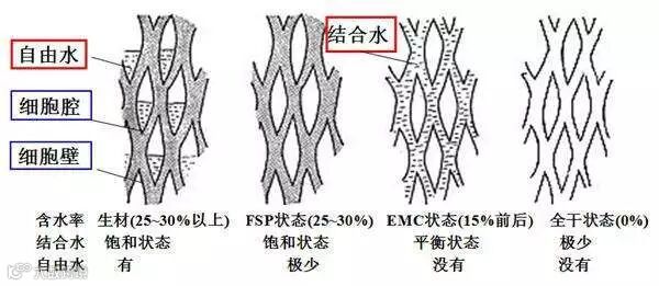 此种状态下,水分在木材细胞腔内主要呈液体状态,水蒸汽也以饱和状态存在于细胞腔内。