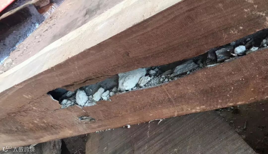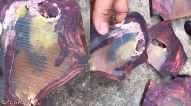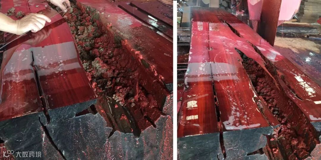 做红木家具的人买红木原料也容易被骗。你看,这样子开料开出来的就是水泥了,里面的石头水泥不光吃重,整块木料对于做家具的来说等同废物。