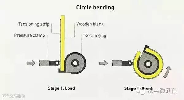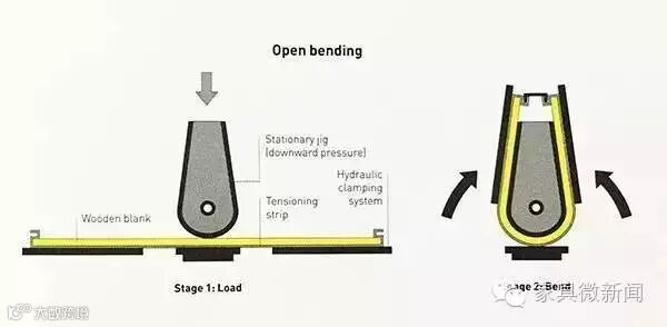 通过将蒸汽加热过的木材反复施压于模具,最后做到轮廓紧贴模具表面形成热弯曲度,适用于开放的曲线形体成型,例如座椅的靠背等。