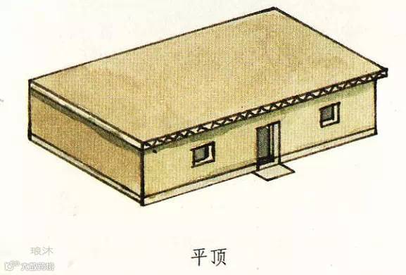 建筑的顶部是平的。这种“平”包括顶部中间略有突出,或是屋顶拥有较小坡度的一面坡,这是与单坡顶最大的区别(单坡顶屋顶坡度较大)。多出现于我国的西北、西南和华北等地区。