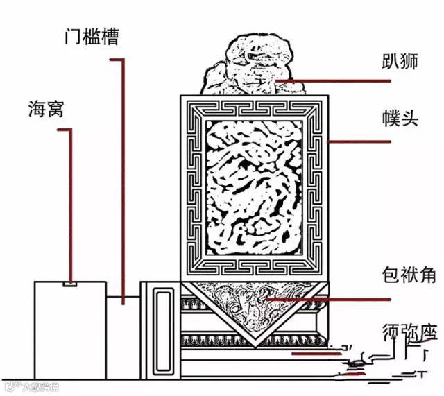 门墩常见于四合院建筑,整体称门枕石,门外部分称为门墩,主要有箱形和抱鼓形(抱鼓石)两种。门枕石在中间有一个槽用于支撑门框,门内部分有一海窝用于插入门纂(门轴的下端),与固定在中槛上的连楹一起起到固定门轴,便于门的开关的作用。
