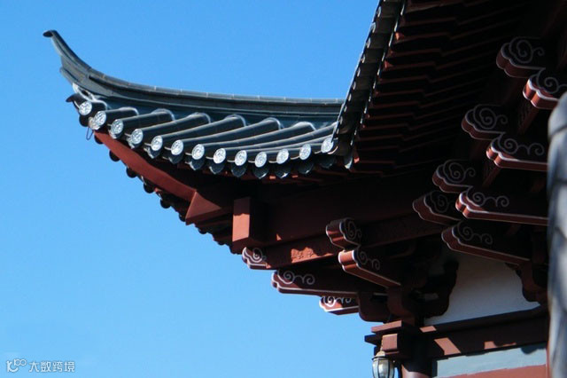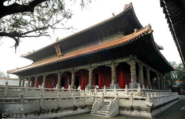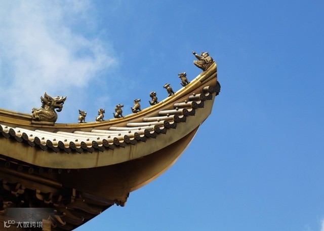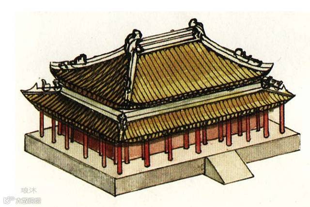 重檐庑殿顶庄重雄伟,是古建筑屋顶的最高等级,多用于皇宫或寺观的主殿,如故宫太和殿、泰安岱庙天贶殿、曲阜孔庙大成殿等。