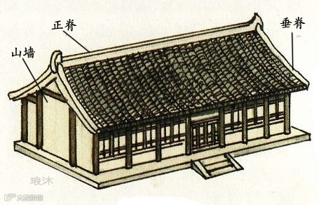 又称挑山顶,有五脊二坡。屋顶伸出山墙之外,并由下面伸出的桁(檁)承托。因其桁(檁)挑出山墙之外,“挑山”之名由此而来。悬山顶四面出檐,也是两面坡屋顶的早期做法,不过中国古代的重要建筑基本没有使用悬山式屋顶的,特别是唐代以前尤为少见。