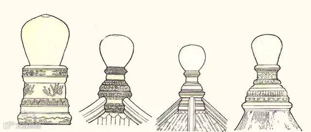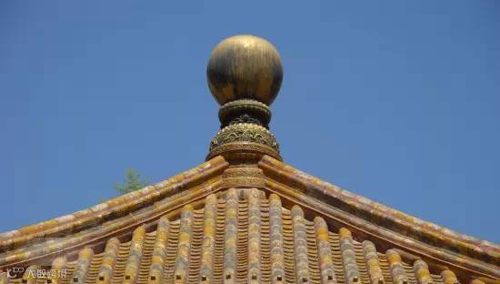 在建筑物的顶部中心位置,尤其是攒尖式屋顶的顶尖处,往往立有一个圆形或近似圆形之类的装饰,它被称为“宝顶”。在一些等级较高的建筑中,或者确切地说,在皇家建筑中,宝顶大多为铜质鎏金材料制成,光彩夺目。