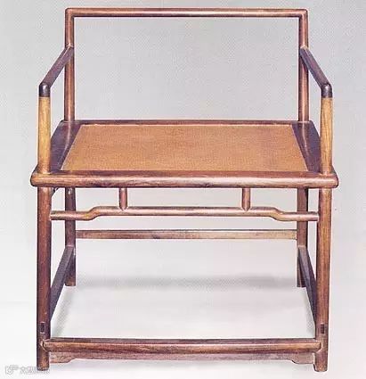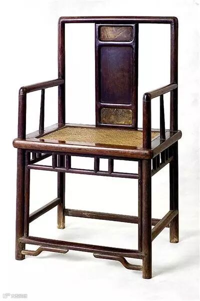 此椅搭脑中部削出斜坡,以便颈项倚靠。两端微微翘起,并略向后兜转,制作圆浑,给人舒适之感。靠背板独木无雕饰,向后弯曲,圆婉合度,至底部始有垂直之意。椅盘做出冰盘沿,线脚稍稍内敛。迎面的券口牙子锼出单尖壶门式轮廓,弧线柔和却有弹性。踏脚枨下托以极窄的牙条,两侧及背面均为单枨。此椅在同类椅具中可谓造型至为简练的一种。