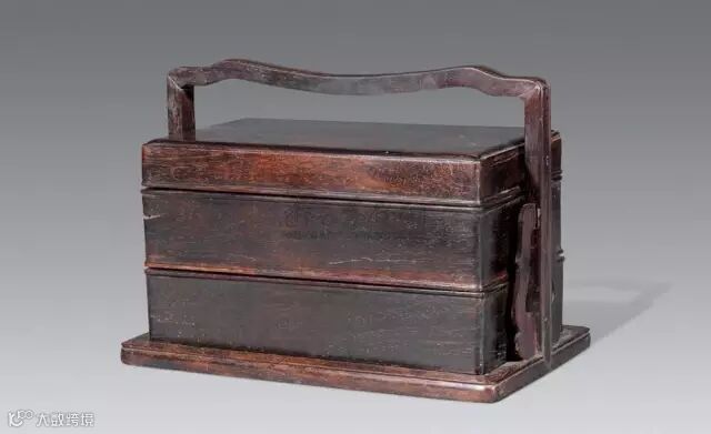 提盒单具者多,成对者少,紫檀成对者就更为难得。该提盒三撞,连同盒盖共四层,置于长方形底框的槽口内。由于盖撞之间及各撞之间均有子口咬合,故盒盖固定后,各撞皆无错开或脱落的现象。