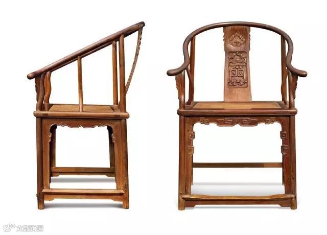 圈椅扶手出头。靠背板浮雕花纹一窠,由相对的螭龙组成,尾部衍变为卷草,卷卷相抵,既对称又不破坏图案。椅两侧有角牙,与靠背板一木为连做。靠背板向后弯转的弧度大于一般圈椅。椅盘的下三面有券口牙子,是比较坚固的做法。迎面牙条所饰的浮雕卷草纹,与靠背板的花纹十分谐调。