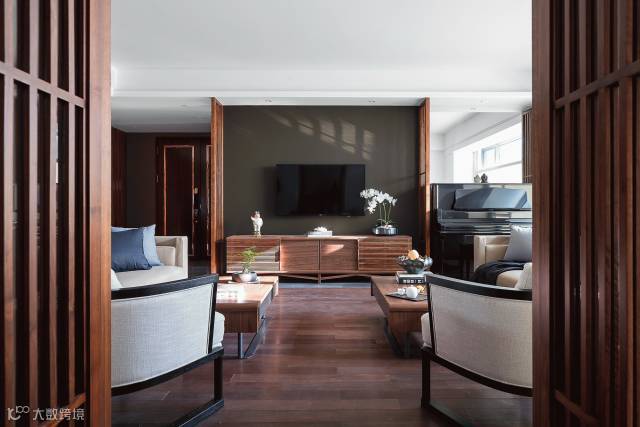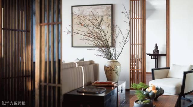 初入玄关,一目了然的中式意境就让人颇为惊喜。步入客厅,干枝的小景,淡淡的禅味,让浮躁的心静下来。当代原创艺术画作清新脱俗,从生活中获取鲜活的艺术感受并从传统美学方法中汲取巧妙的构成元素,完成了一次传统回归。客厅空间以木作生雅致之魂,木案、木地板、木柜,搭配简约的沙发与纯色的抱枕,相映成趣。临窗设有小憩坐台,厅内厅外风景独好,是抚琴冥思的好处所。主人收藏的铁壶、瓷器、佛像更给人带来自然人文古意。