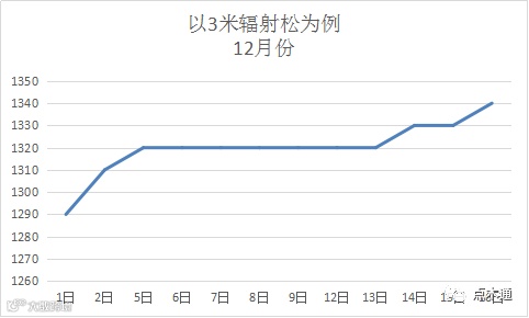 自12月初至今,在近半月的时间内,辐射松迎来了大幅的价格上涨,涨幅高达50元/方。