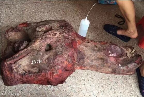土豪买下了之后便在料子上面浇了一些料子专用的开料水,看着这块料子上的瘤疤,果然是非常不错的,说实话,小叶紫檀上能有这丰富的瘤疤还真是少见。
