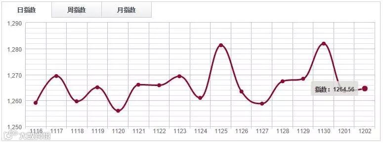 12月2日,中国木材指数(CTI)报收1135.61点,环比上涨0.12%。其中鱼珠木材指数(YTI)收于1051.06点,涨1.22%;福人木材指数(FTI)报收1257.05点,跌0.75%;大西南木材指数(DTI)报收1061.81点,涨0.02%;南康木材指数(JTI)报收1723.97点,涨0.12%。