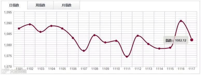 11月17日,中国木材指数(CTI)报收1143.07点,环比上涨0.25%。其中鱼珠木材指数(YTI)收于1035.15点,跌0.34%;福人木材指数(FTI)报收1271.41点,涨0.45%;大西南木材指数(DTI)报收1102.21点,涨0.93%。