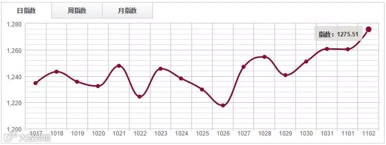 11月2日,中国木材指数(CTI)报收1137.40点,环比上涨0.64%。其中鱼珠木材指数(YTI)收于1042.41点,涨0.52%;福人木材指数(FTI)报收1278.63点,涨0.67%;大西南木材指数(DTI)报收1044.90点,涨0.8%;南康木材指数(JTI)报收1730.11点,涨0.28%。