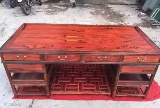 第三,北部料很少有粗线条的黑筋,但底色普遍偏深,而且越老越黑(有些不熟悉酸枝木的人还把这种料说成是“黑酸枝”),也可以理解为是大面积黑筋,甚至可以说不是黑筋不明显,而是黑筋太过密集之故。北部料制作成家具,的确接近于紫檀木的外观效果(这是红黄底色的南部料所无法企及的)。而且,是一种极品交趾黄檀,气干密度还大于紫檀木,油性极重,底色很深,完全看不出黑筋,这种料也仅仅产于北部山区的一个很小的地域内。按照我对木材价值的理解,北部料才是大红酸枝中的顶级货色,其价值应该比南部料高出30-50%左右。鉴于北部料数量极为有限,从使用的角度而论,用于制作家具还是显得奢侈了些,建议主要用来制作高级红木工艺品,而其中的超级大料,可以直接成为收藏品。