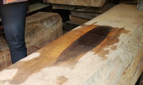 上图刚刚用水冲洗过的北部料(黑料)大料心材,黑筋不是粗条状而是片状,且并不十分明显。这根料砍伐时间不长,颜色并不太黑。