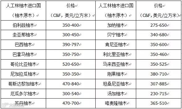 印度是柚木消耗大国,每一年印度都进口大量人工种植林柚木。1月份印度从巴西、巴拿马、哥伦比亚、苏丹等国家进口的人工林柚木质量有了很大改善,从而也付出更高的价格。有分析人士指出,种植林柚木的产量和质量都有改善的空间。由于缅甸柚木出口禁令,印度曾一度受到柚木短缺的困扰,其他国家尤其是拉丁美洲更高质量的人工林柚木的进口,给印度柚木制品厂家解决了了大难题。以下是印度进口的人工林柚木价格(C&F),价格根据柚木质量、长度、平均径级而定: