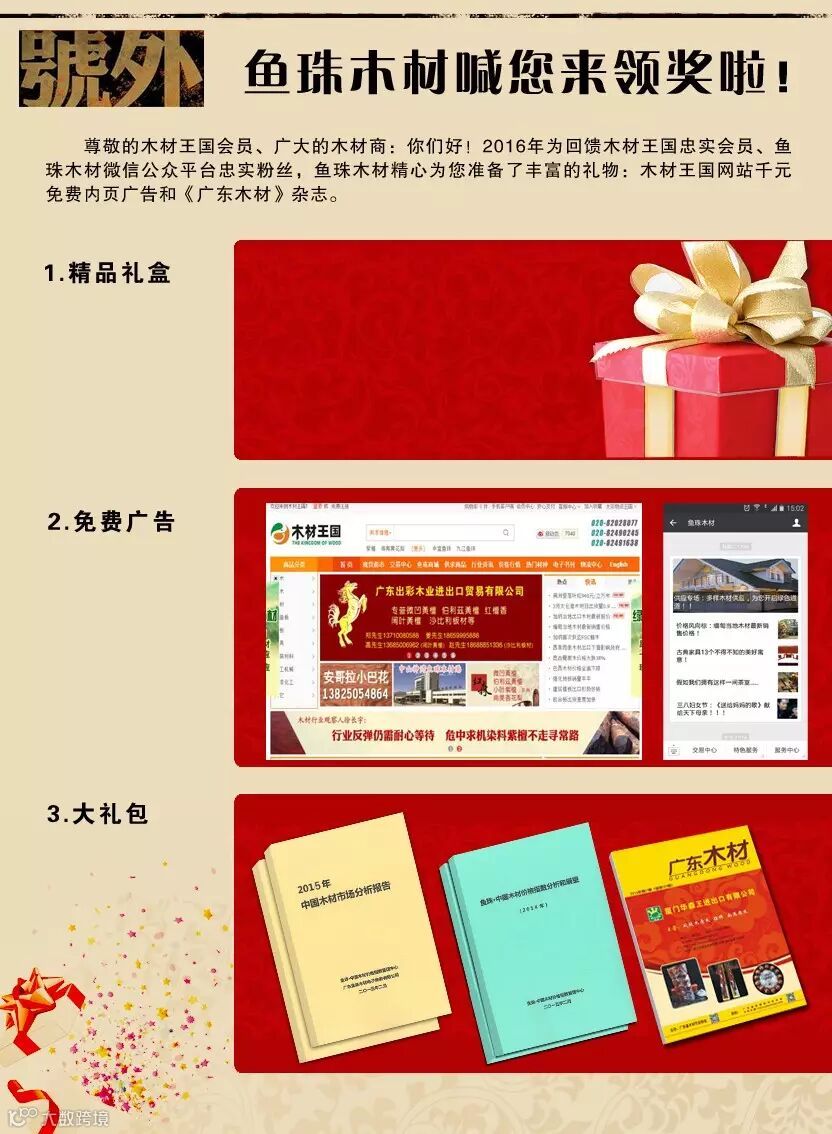 小编提示:参与这次活动的所有获奖的用户都可以得到我们的礼品。小编在这里给大家提供两个选择,1.精品礼盒+大礼包,2.木材王国网站+微信平台免费内页广告。获奖的用户只能二选一哦,如果您已经确定要哪一份礼物了请点击微信最底端的右侧“写留言”处注明,如果您还不确定可以致电18320094573了解详情。我们期待您的来电!